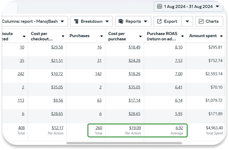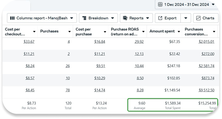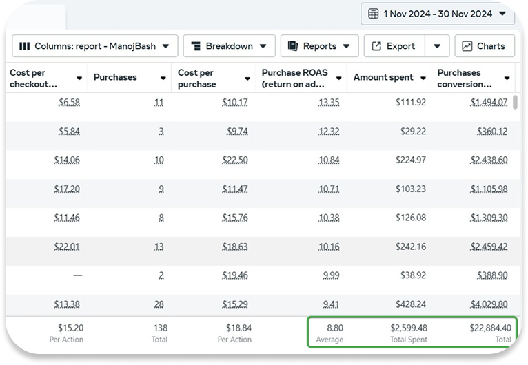 With a budget of $2,599.48, we generated $22,884.40 in purchases, achieving a solid ROAS of 8.80. The strategy was the mix of precision targeting, audience segmentation, and ad creatives that spoke directly to the customer’s needs. The result wasn’t just impressive numbers but a campaign that proved high returns don’t always require high budgets.